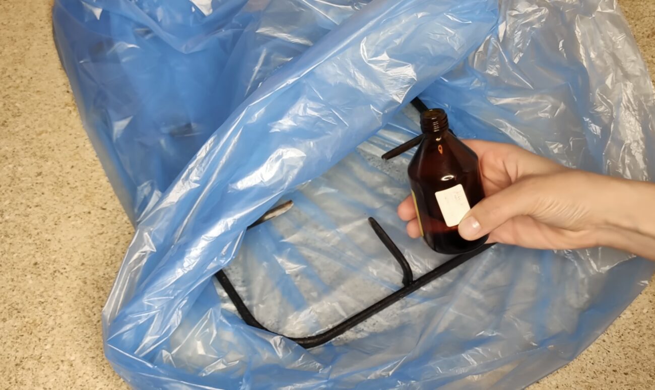 Для чищення візьміть великий пакет без дірок і засуньте туди решітку. Тепер рівномірно розпиліть нашатирний спирт з пульверизатора чи просто залийте всю решітку розчином. Головне тут не кількість рідини, а саме концентрація випарів у закритому просторі, тому важливо дуже щільно завʼязати пакет. Можна огорнути ще одним пакетом для надійності.