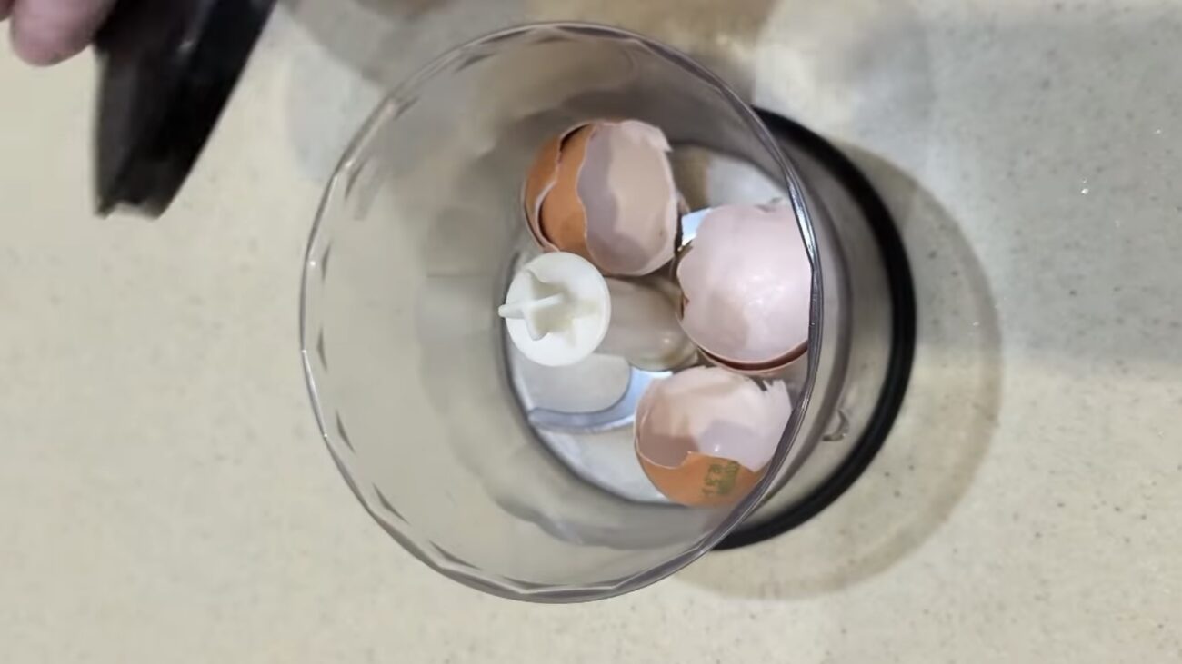 Якщо ж у вас занурювальний блендер, можна хитро пристосуватися: переверніть його ножами догори. Насипте шкаралупу (попередньо трохи подрібнивши її руками, щоб більше влізло в “чашу” навколо ножів), накрийте зверху харчовою плівкою і трохи прокрутіть її руками, щоб при натисканні кнопки дрібні частинки не розлетілися навколо. У такому перевернутому стані увімкніть блендер на максимум.