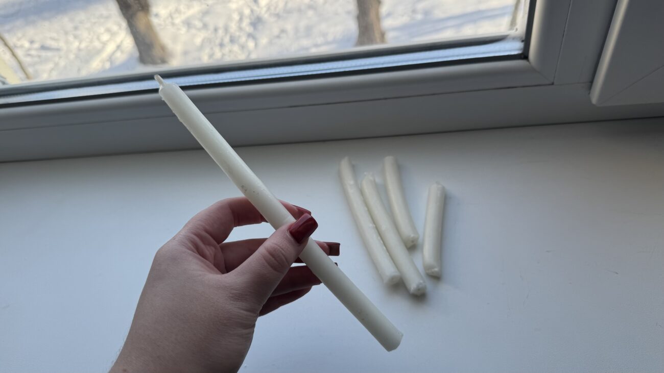 Але для кращого ефекту досвідчені господині радять спочатку “пролити” шпарину рідким парафіном — потримайте запалену свічку під нахилом, щоб кілька крапель затекли вглиб і застигли там. Якщо ці щілини між підвіконням і рамою, то накапайте парафін ближче до щілини та підсувайте його ножем, поки він рідкий.