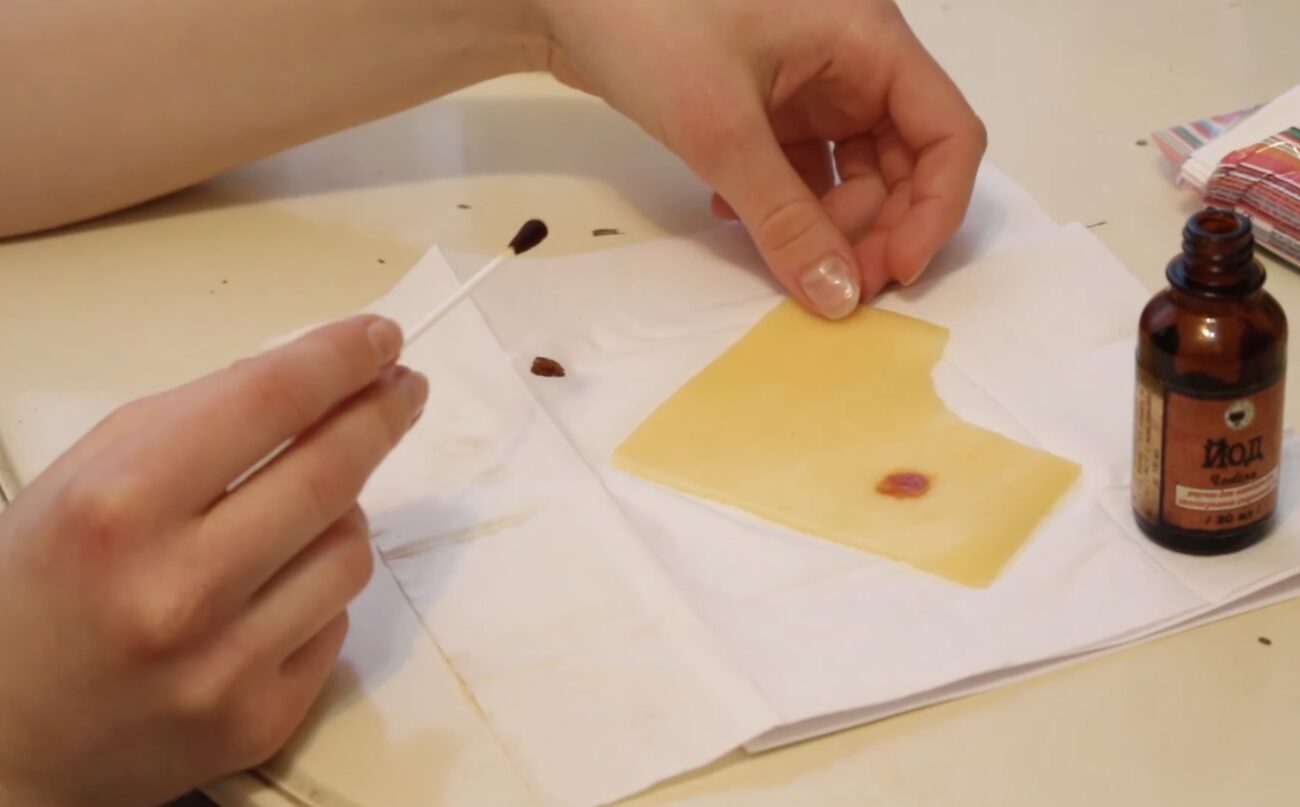 Для перевірки вам знадобиться йод і сам сир, який ви хочете перевірити. Покладіть шматочок сиру на тарілку та капніть зверху одну-дві краплі йоду. Тепер просто дивіться, що відбувається. Якщо йод лишається рудим або просто потроху жовтіє – перед вами справжній продукт. Натуральний білок із йодом ніякої реакції не дає.