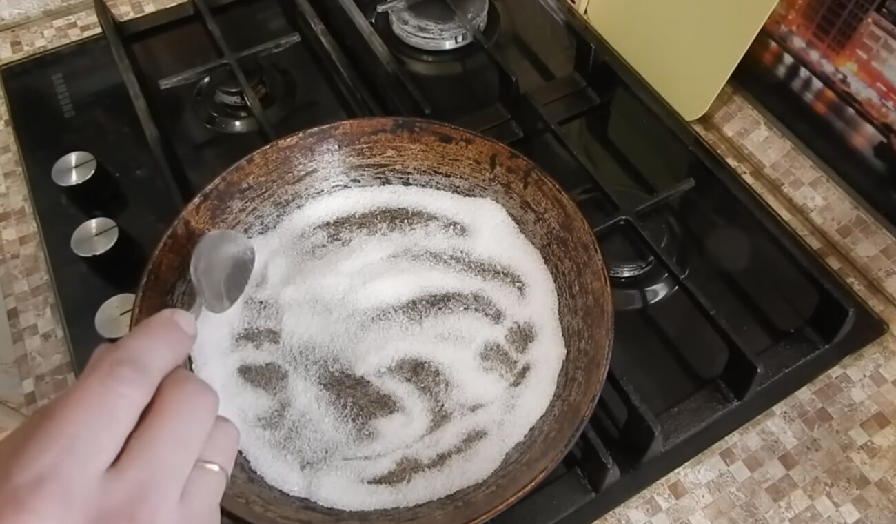 Насипте на дно сковороди 2 столові ложки звичайної солі. Розподіліть її рівномірним шаром по всій поверхні. Тепер поставте сковородку на середній вогонь і почніть прожарювати сіль. Не відходьте від плити, постійно помішуйте деревʼяною лопаткою. Процес займає у вас хвилин десять-пʼятнадцять від сили.