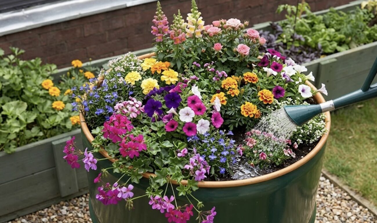 Для тих, хто любить квіти, стара бочка – це готова клумба, причому не звичайна. Її можна розрізати навпіл (упоперек або вздовж) і зробити каскадний квітник. Дуже ефектно виглядає так звана перекинута клумба: бочку кладуть на бік, трохи прикопують, а з її отвору висаджують квіти так, ніби вони “виливаються” на газон. Найкраще для цього підходять петунії або лобелії.