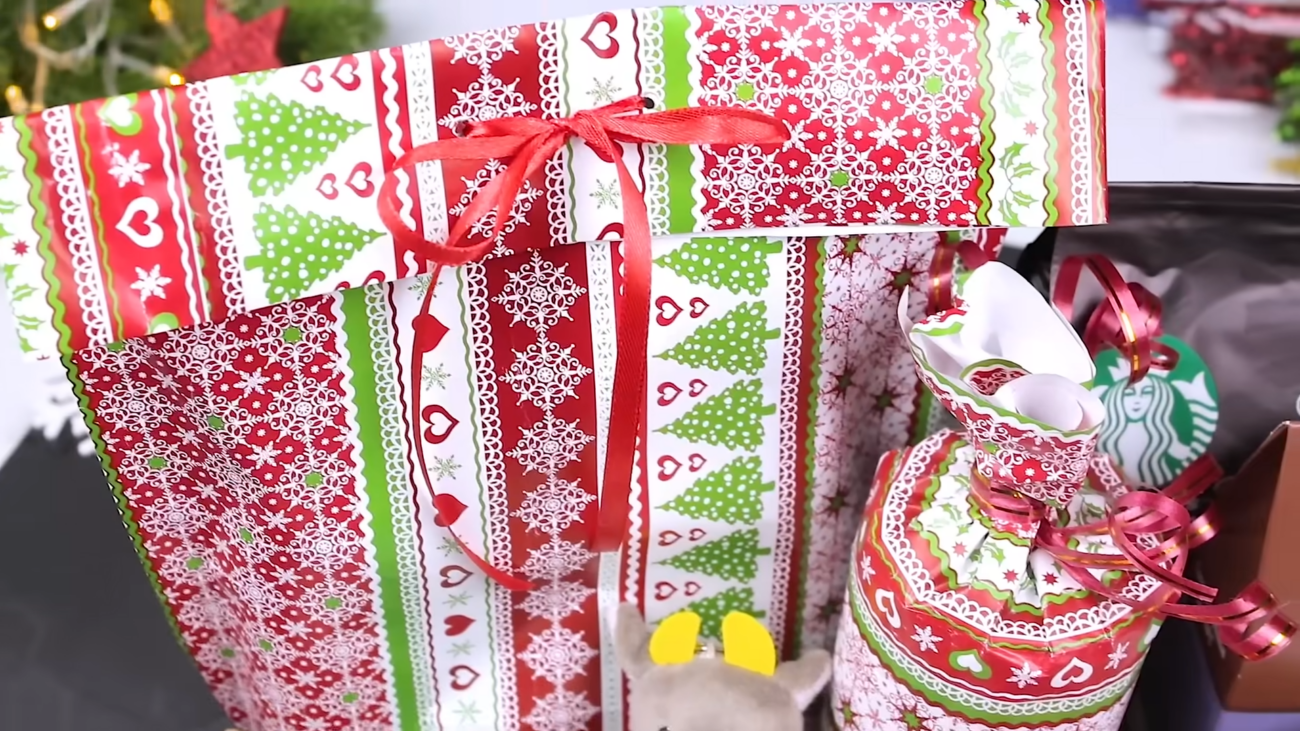 Для маленьких презентів стане у пригоді картонна туба. Її достатньо скласти з двох боків, злегка промацати краї, щоб вони згиналися рівно, а всередину покласти невеликий подарунок. Зверху тубу можна обгорнути папером, закріпити скотчем і перев’язати стрічкою. Така мінікоробочка підходить для дрібних речей та легко вішається на ялинку як прикраса.