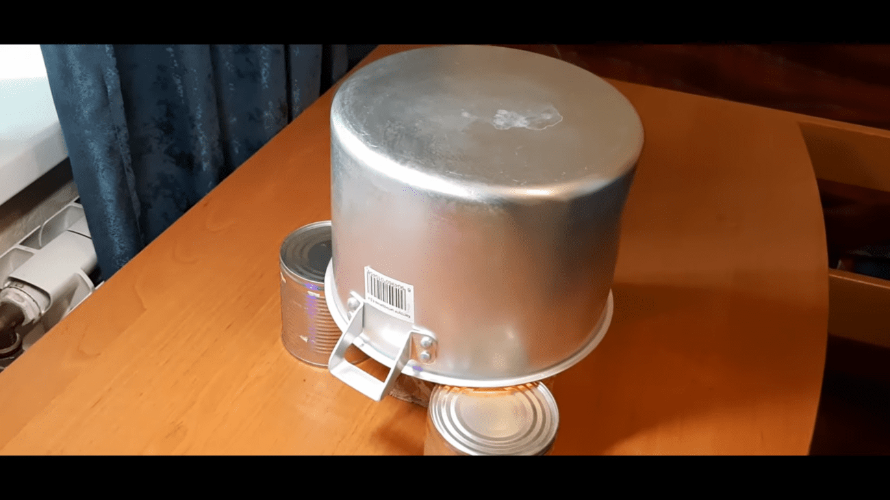 Запаліть гніт, встановіть світильник між банками-опорами та накрийте його кастрюлею дном догори. Ви побачите, що метал починає нагріватися миттєво, особливо у верхній частині, куди спрямовуються потоки гарячого повітря. Буквально за п’ятнадцять хвилин корпус стане настільки гарячим, що до нього буде неможливо доторкнутися. Якщо капнути трохи води на поверхню, вона моментально випарується з характерним шипінням, що свідчить про дуже високу температуру нагріву.