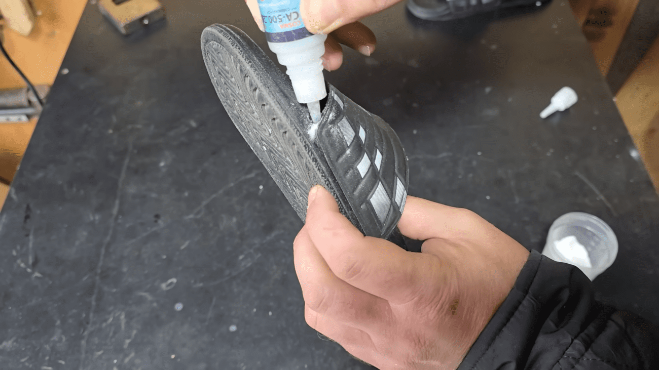 Тепер акуратно залийте все суперклеєм і швидко притисніть частини одна до одної. Почнеться реакція, матеріал нагріється – це нормально. Саме в цей момент відбувається “вплавлення”, і з’єднання стає дуже міцним. Притискайте кілька хвилин, не рухайте взуття, дайте суміші повністю схопитися.