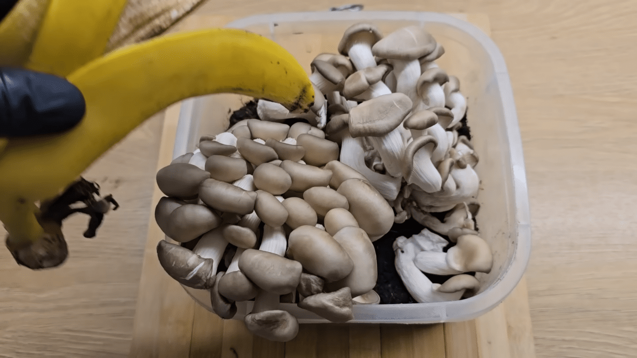 Отримані шматочки акуратно розкладіть по поверхні ґрунту. Злегка присипте їх землею буквально на кілька міліметрів. Важливо, щоб між банановою шкіркою та грибними шматочками був мінімальний шар ґрунту. Так гриби швидше отримають поживні речовини. Бананова шкірка містить багато корисних елементів, які можуть сприяти росту грибів.