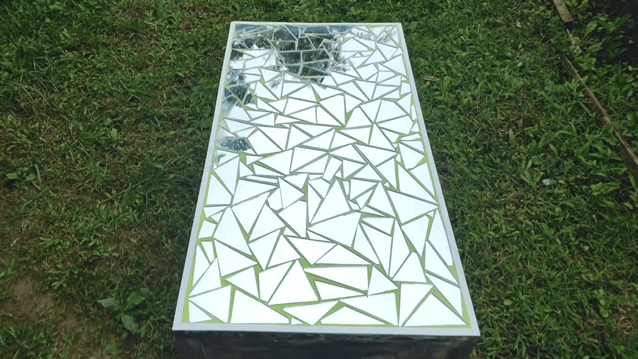 Після цього нанесіть клей на поверхню столу рівномірним шаром. Окремо покрийте клеєм і зворотний бік скляних шматочків. Дайте клею трохи підсохнути, після чого починайте викладати фрагменти на поверхню. Розміщуйте їх у довільному порядку або створіть певний візерунок – усе залежить від вашої ідеї. Залишайте невеликі проміжки між шматочками.