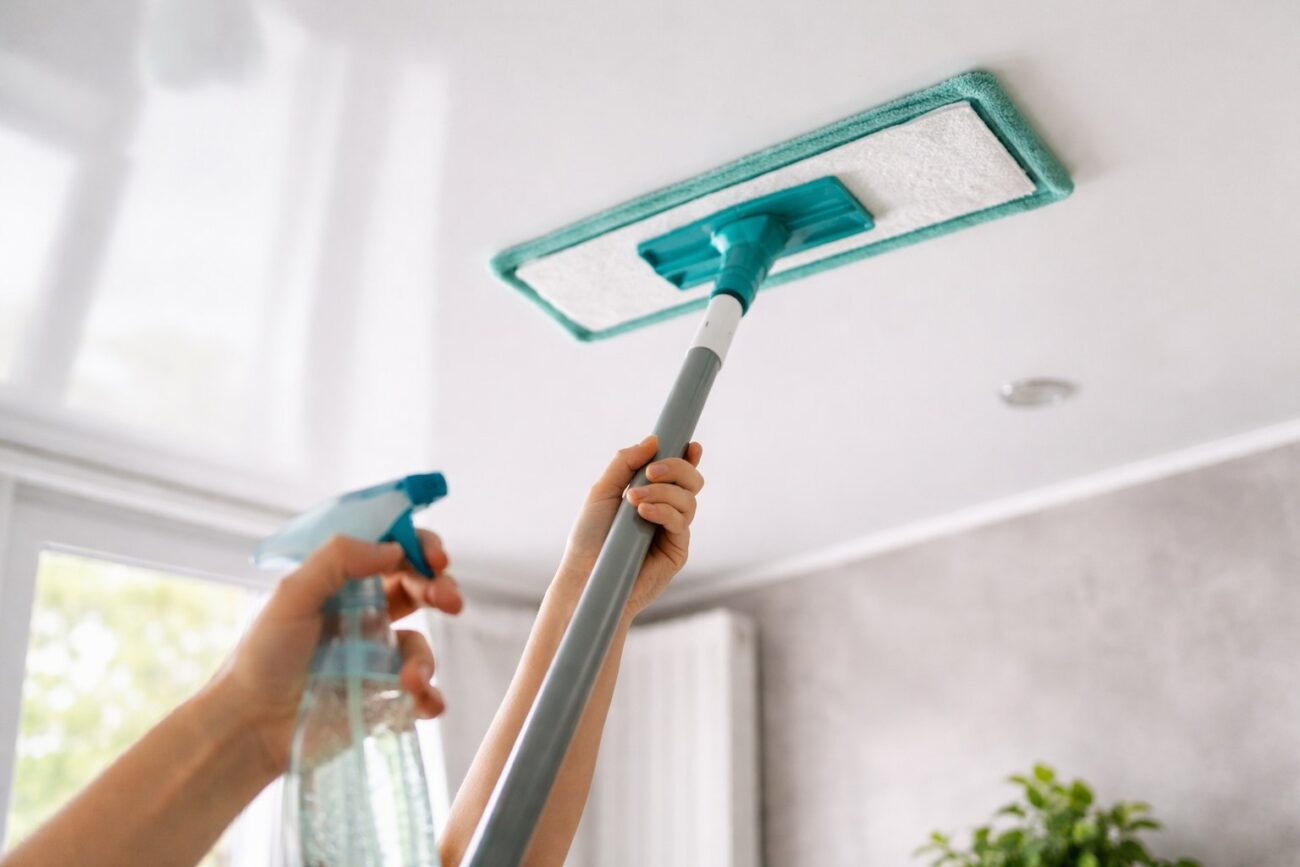 Насамперед потрібно прибрати пил з усієї поверхні і тільки після цього можна сміливо переходити до видалення помітних плям. Під час роботи з високими стелями дуже зручно використовувати швабру із м’якою насадкою. Такий інструмент дає змогу легко дістати до найважкодоступніших місць без використання сходів чи драбини.