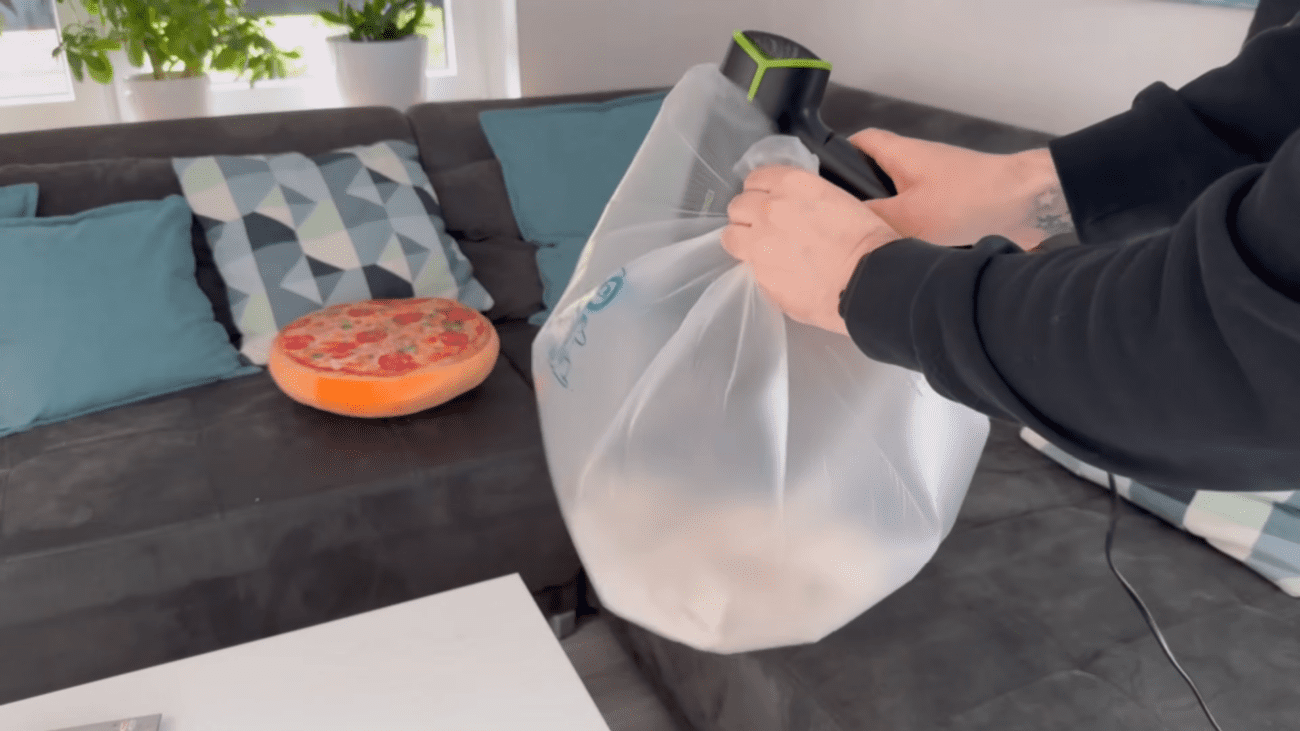 Потім використайте фен. Направте тепле повітря в пакет, трохи прикривши його, щоб тепло залишалося всередині. Час від часу струшуйте пакет і змінюйте положення одягу, щоб він висихав рівномірно.