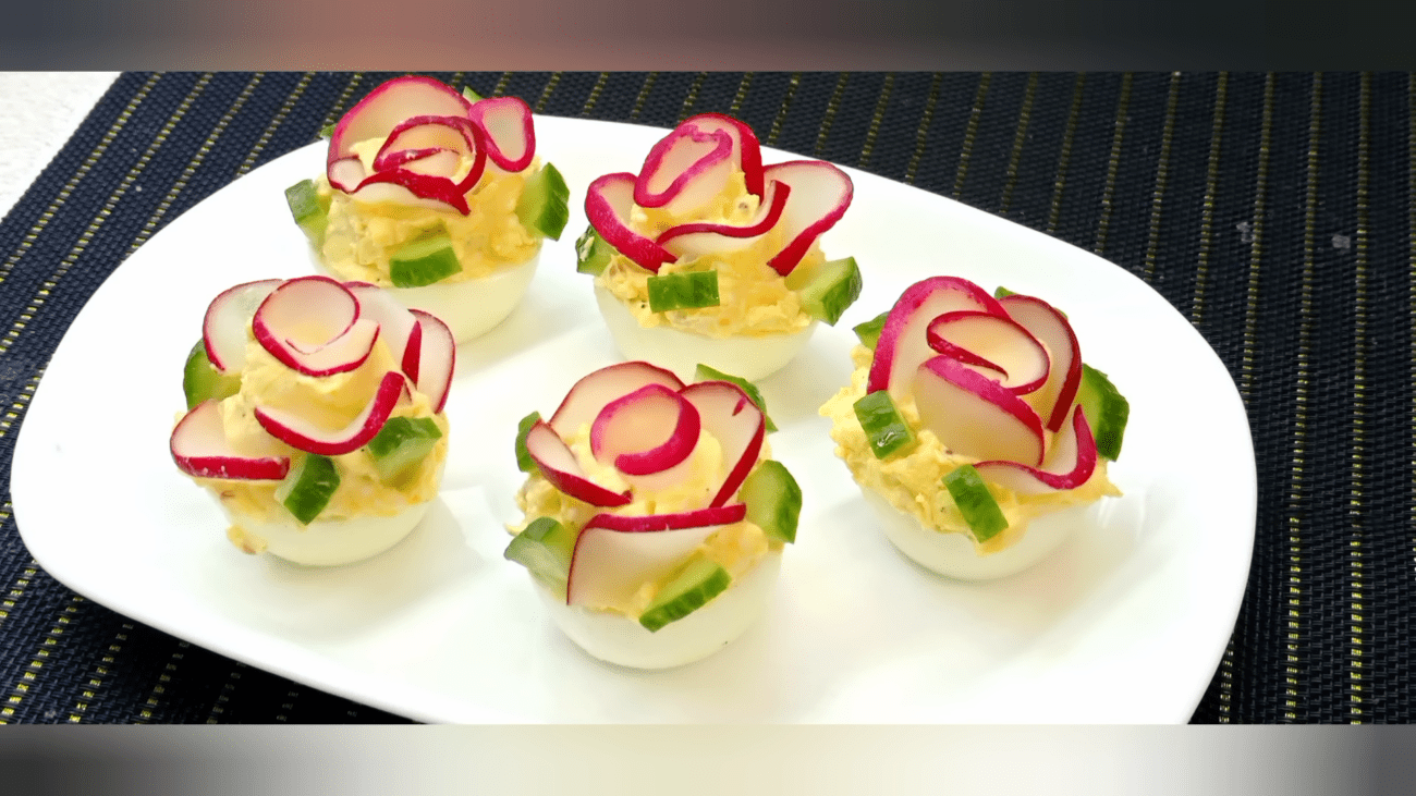 Наповнюємо яєчні половинки так, щоб зверху утворився невеликий “купочок”, у який зручно вставляти пелюстки. Коли овочі підсохли, формуємо з редису маленькі пелюстки, розрізаючи слайси навпіл. Розміщуємо їх у кремовій начинці по колу, створюючи вигляд троянди. Потім так само нарізаємо огірок трикутниками й доповнюємо ними композицію, вставляючи між редисовими пелюстками.