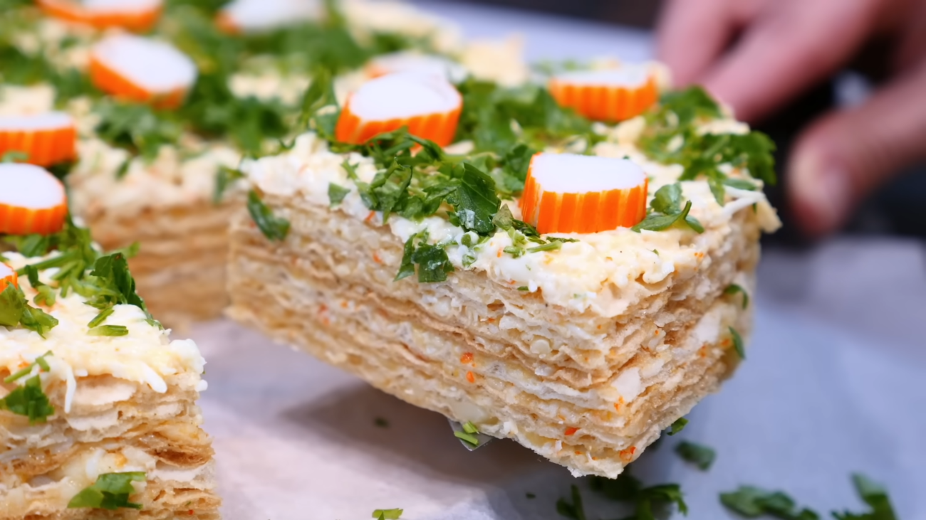 Такий торт легко нарізати на невеликі квадратні порції. Для зручності подачі іноді додають шпажки, щоб кожен гість міг без зусиль взяти шматочок. У результаті виходить ніжна, соковита, ароматна закуска, яку можна приготувати заздалегідь і подати як святковий варіант або як швидкий домашній перекус.
