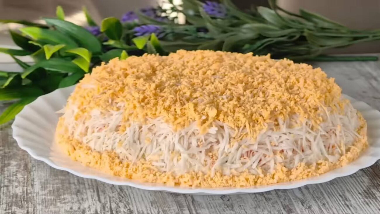 Перший шар – курка; другий шар – яєчні білки; третій шар – огірки; четвертий шар – морква по-корейськи; п’ятий шар – копчений сир; шостий шар – два жовтки, які залишилися.