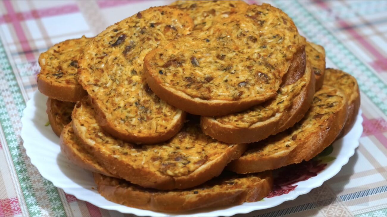 А далі ми не просто мажемо це на хліб, а робимо гарячі бутерброди. Наріжте батон, щедро змастіть кожен шматочок намазкою і викладіть на деко, застелене пергаментом. Відправляйте в розігріту духовку буквально на 5-7 хвилин. Нам не треба сушити хліб до стану сухарям, важливо, щоб тільки намазка трохи схопилася і підпеклася.