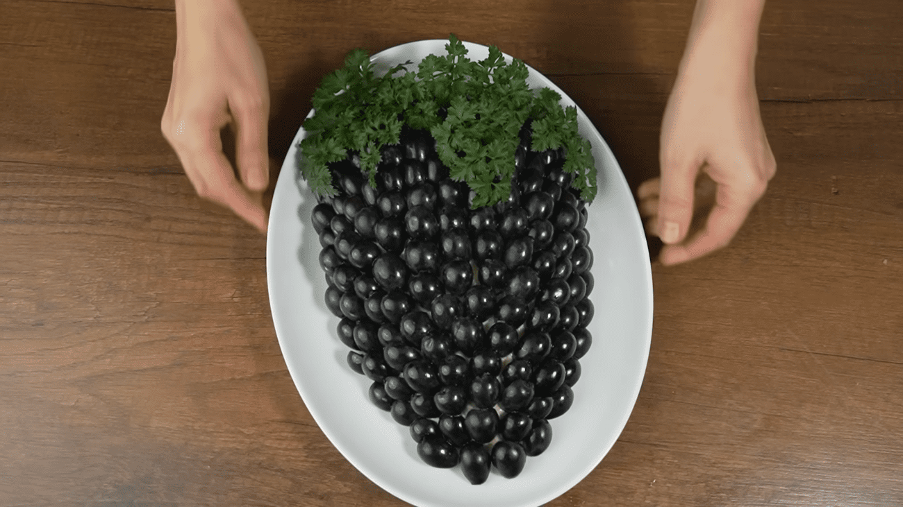На завершення прикрашаємо салат гілочками петрушки, створюючи імітацію виноградного листя. Страва виходить надзвичайно ефектною, апетитною та повністю виправдовує свою назву. Усі інгредієнти чудово поєднуються, утворюючи ніжний і гармонійний смак, який сподобається кожному.