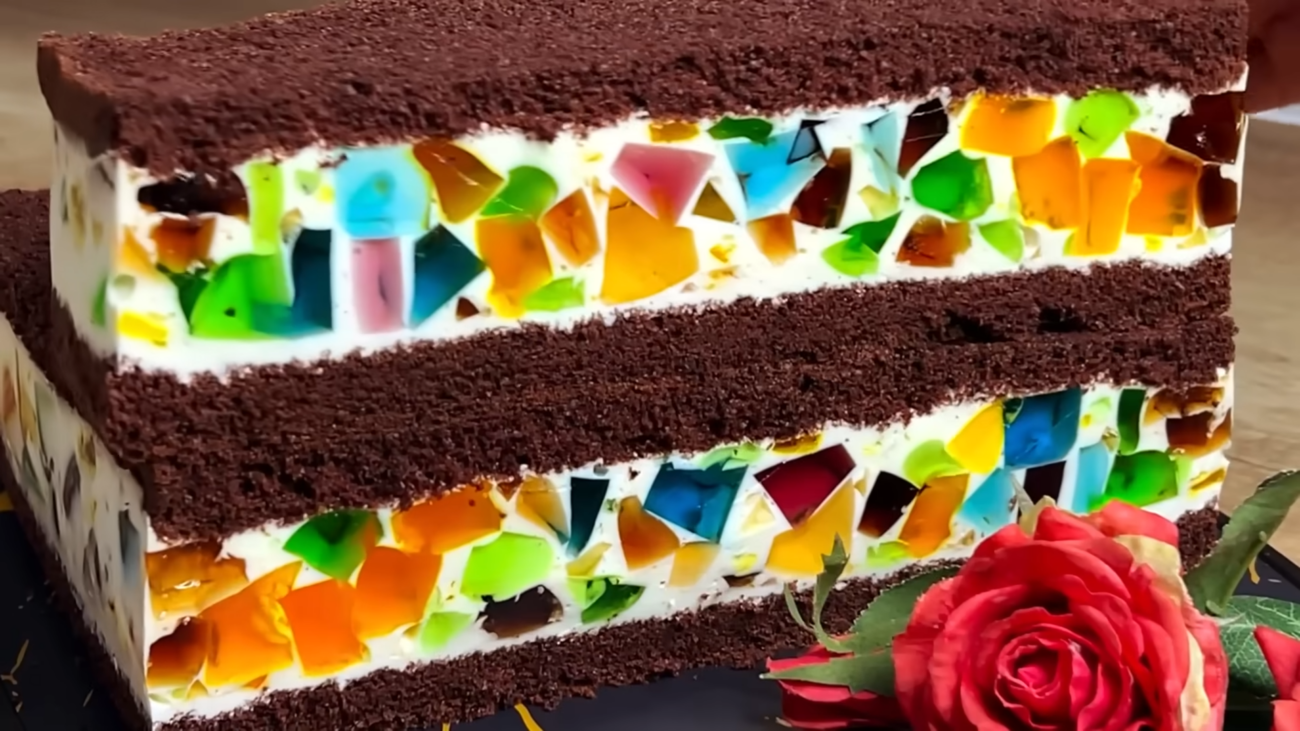 На перший шар бісквіта виливаємо тонку частину крему й залишаємо в холодильнику приблизно на десять хвилин, щоб він трохи схопився. Після цього нарізаємо желе кубиками та додаємо в кремову основу, перемішуємо й акуратно виливаємо всю масу на бісквіт. Розрівнюємо поверхню та накриваємо другим шаром бісквіта.