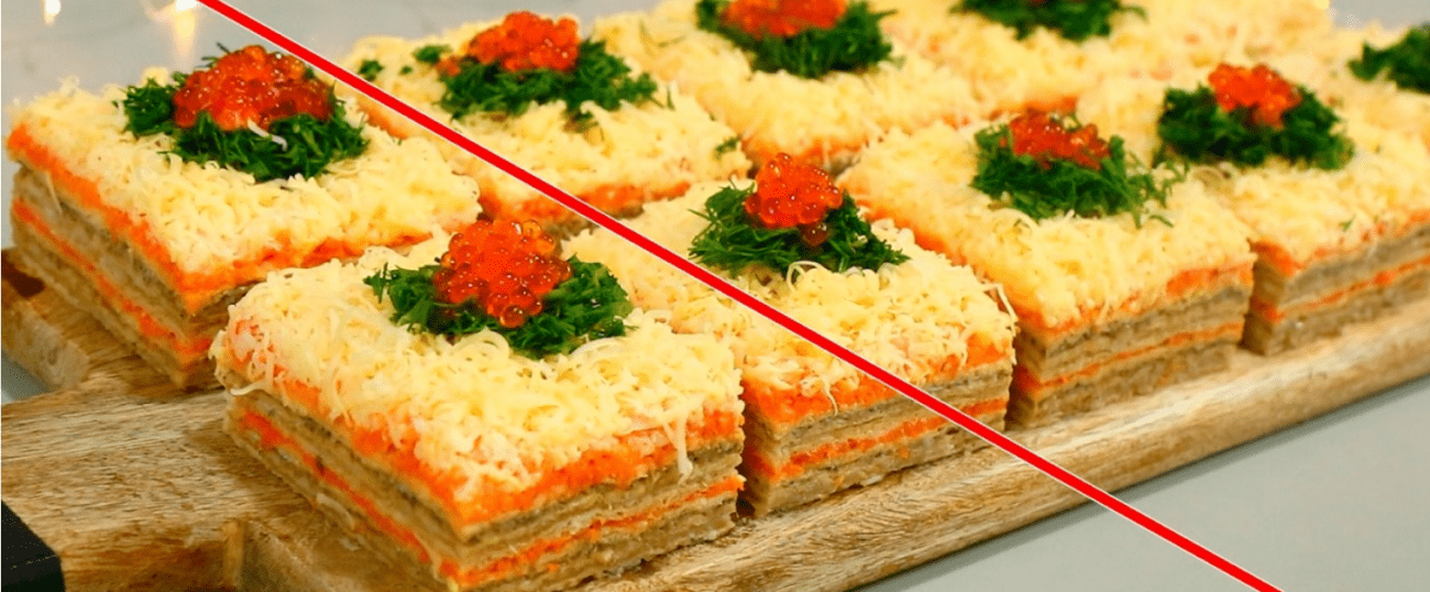 На зрізі закуска виглядає акуратно, шари добре тримають форму, коржі стають м’якими. Але під час дегустації виявляється головна проблема. Вафельні коржі повністю вбирають вологу й дають домінуючий смак, гриби відчуваються яскравіше за все, а оселедець залишається лише у вигляді віддаленого післясмаку. Морква й сир майже губляться.