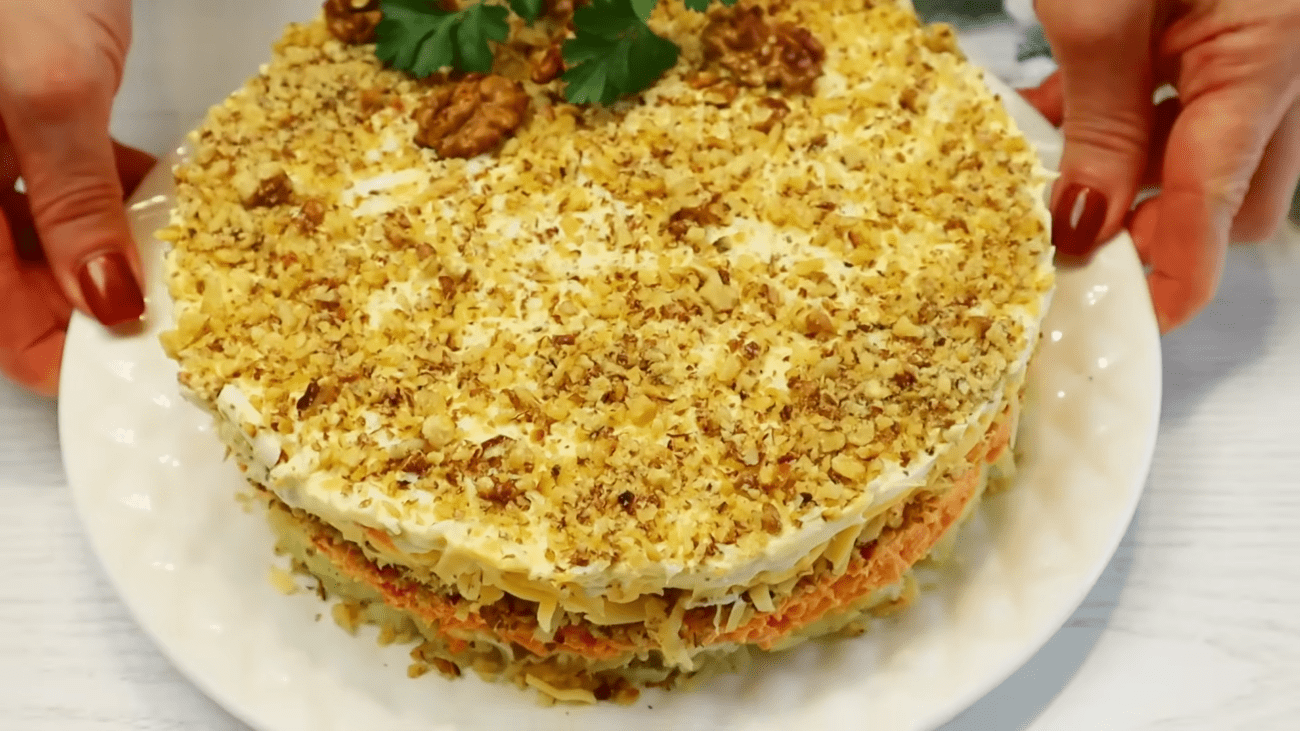 Для формування салату встановлюємо роз’ємне кільце на блюдо. Першим шаром викладаємо відварну картоплю, натерту на великій терці. Легенько солимо, додаємо трохи чорного меленого перцю і наносимо тонку сіточку з майонезу. Далі рівномірно розподіляємо моркву з соусом, після чого викладаємо шар подрібнених горіхів.