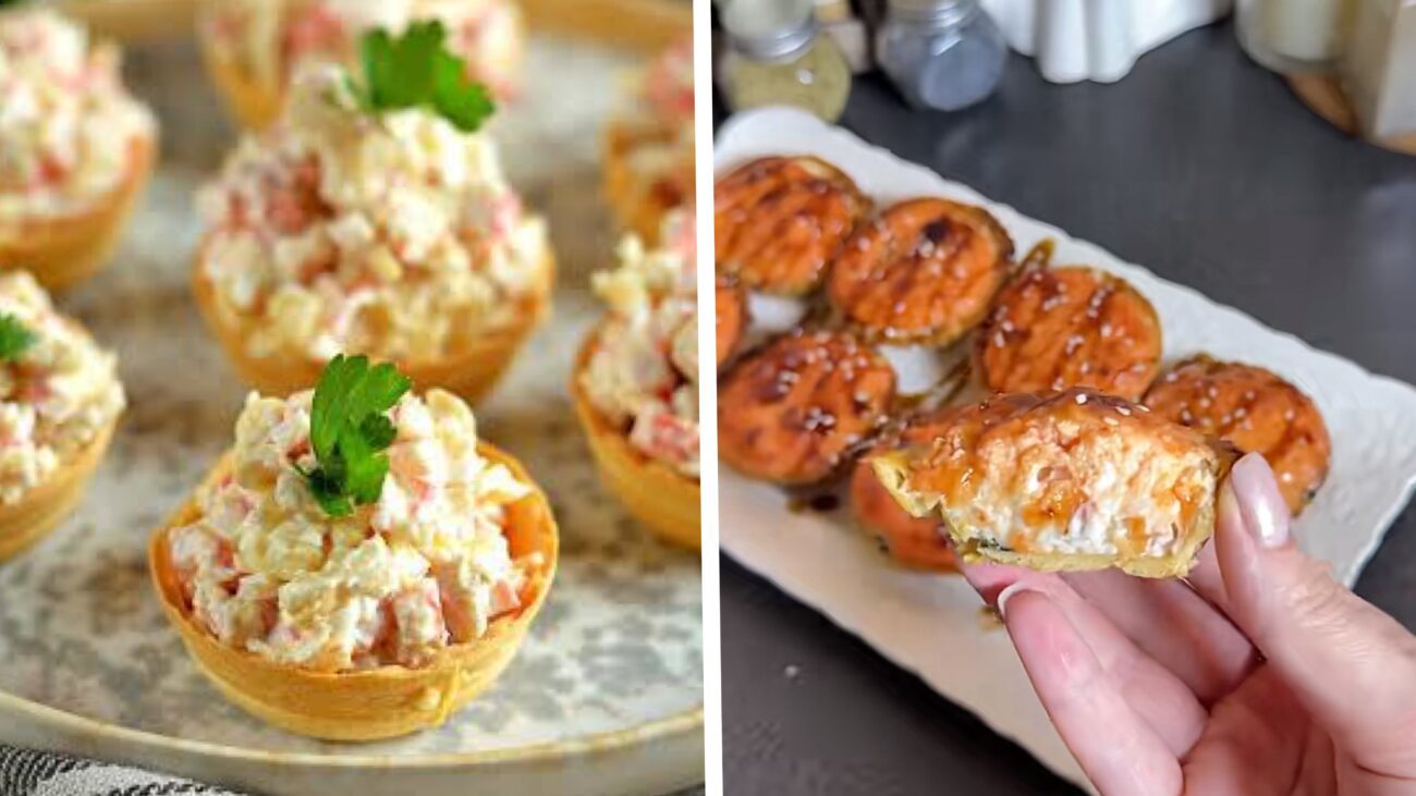 Майже всі тарталетки можна просто запекти в духовці. Під дією температури тісто знову підсушується і стає хрустким, а начинка прогрівається. Цей метод ідеально підходить для кошиків із крабовими паличками, м’ясом, крем-сиром чи грибами — всі ці продукти чудово смакують у гарячому вигляді. Єдиний виняток — закуски зі свіжими овочами, як-от огірок чи помідор, їх запікати не варто.
