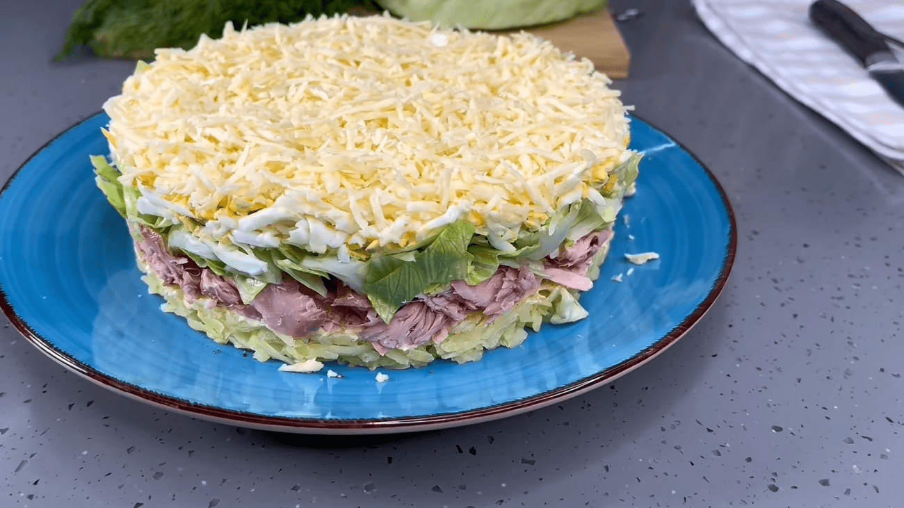 Завершальним шаром натираємо сир на середній або дрібній тертці, формуючи акуратну верхівку. За можливості ставимо салат у холодильник хоча б на годину, щоб він краще тримав форму і просочився.