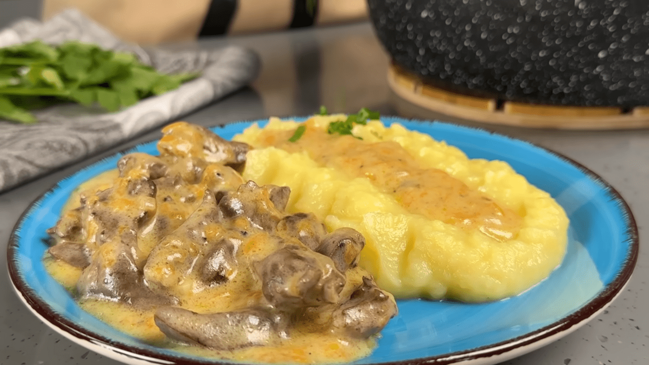 Ось виправлений текст. Основні правки стосувалися заміни русизмів (шампіньйони, тушити) на питомі українські відповідники та уточнення кулінарної термінології.