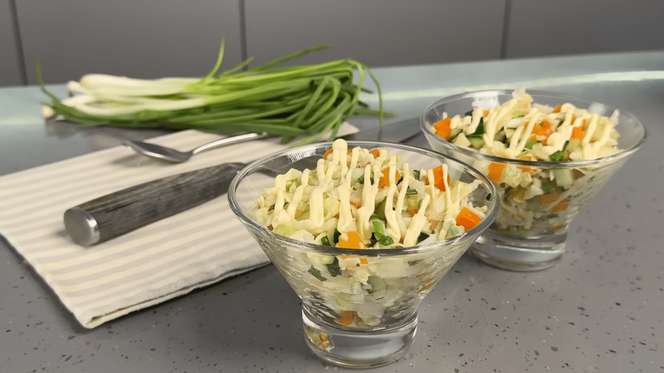 Подавати салат зручно порційно, наприклад у креманках. Така подача виглядає охайно, дозволяє побачити всі шари й робить страву більш святковою. Салат виходить легким, свіжим і водночас цікавим за смаком, хоча всі продукти добре знайомі.