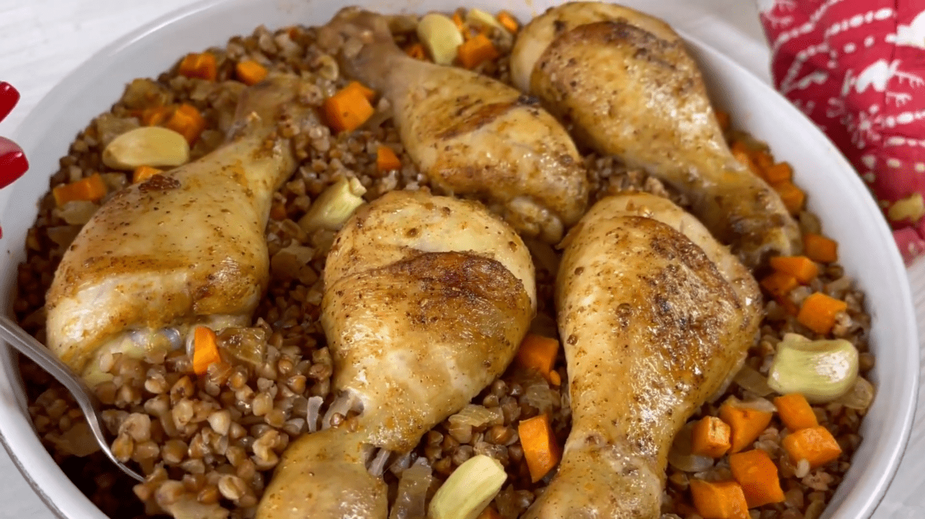 Форму відправляємо в духовку, розігріту до 180 градусів, приблизно на 30–35 хвилин. За потреби форму можна накрити фольгою, щоб гречка не підсихала. У результаті страва виходить розсипчастою, соковитою й дуже ароматною, ідеальною для сімейного обіду або вечері.