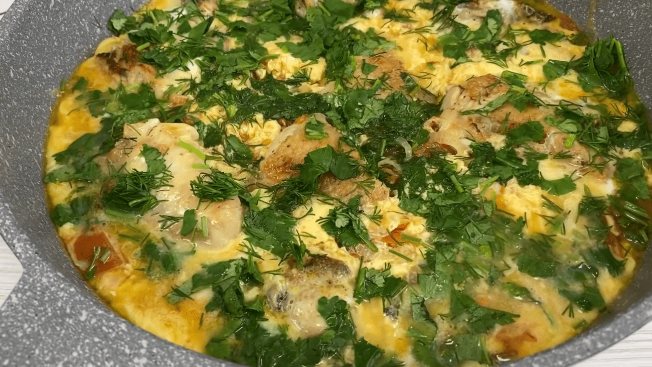 Тим часом розбиваємо яйця в миску, додаємо дрібку солі та злегка збовтуємо виделкою до однорідності, не збиваючи. Дрібно нарізаємо зелень. Коли курка з овочами добре протушиться, рівномірно заливаємо страву яєчною сумішшю, накриваємо кришкою та готуємо ще кілька хвилин, щоб яйця схопилися.