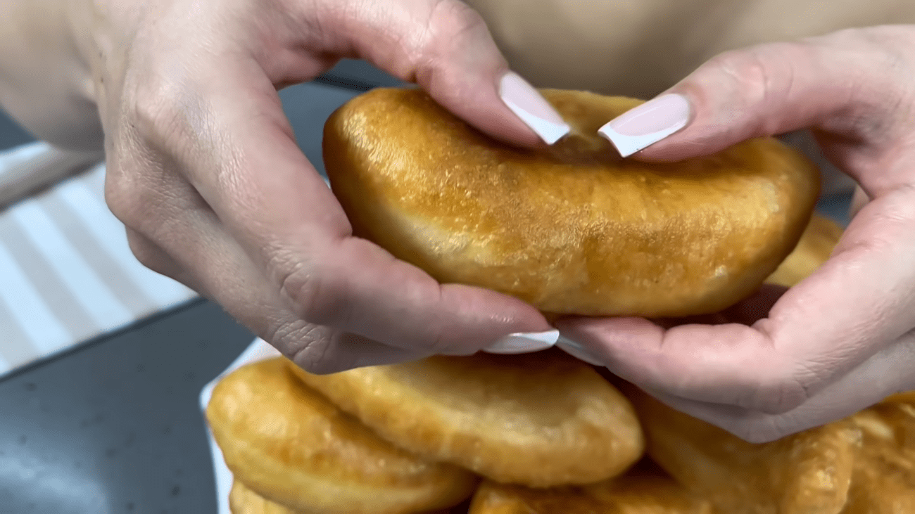 Готові пиріжки викладаємо на паперові рушники, щоб прибрати зайву олію. Вони виходять з тонкою хрусткою скоринкою та ніжною начинкою всередині.