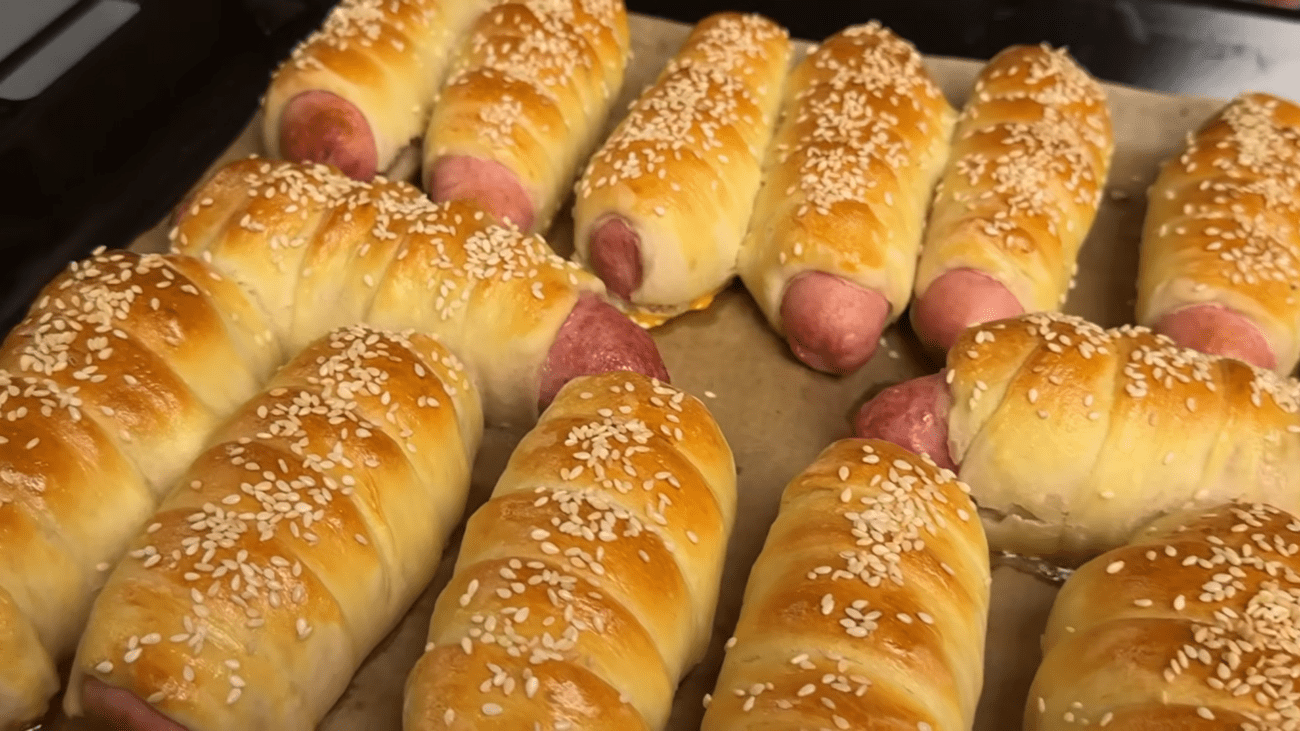 Перед випіканням змащуємо сосиски в тісті сумішшю жовтка й молока, за бажанням посипаємо кунжутом. Випікаємо в розігрітій до 190 °C духовці 20–25 хвилин до рум’яної скоринки.