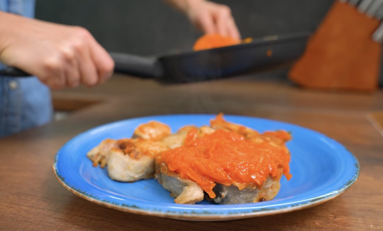 Поки риба остигає, цибулю треба нарізати четвертинками, а моркву натерти на крупній тертці. Спершу треба обсмажити цибулю до прозорості, потім додати до неї моркву і смажити Додайте сіль, цукор та краплю оцту так, щоб соус мав приємний кисло-солодкий смак. Накрийте кришкою і тушкуйте овочеву суміш 15 хвилин на маленькому вогні.