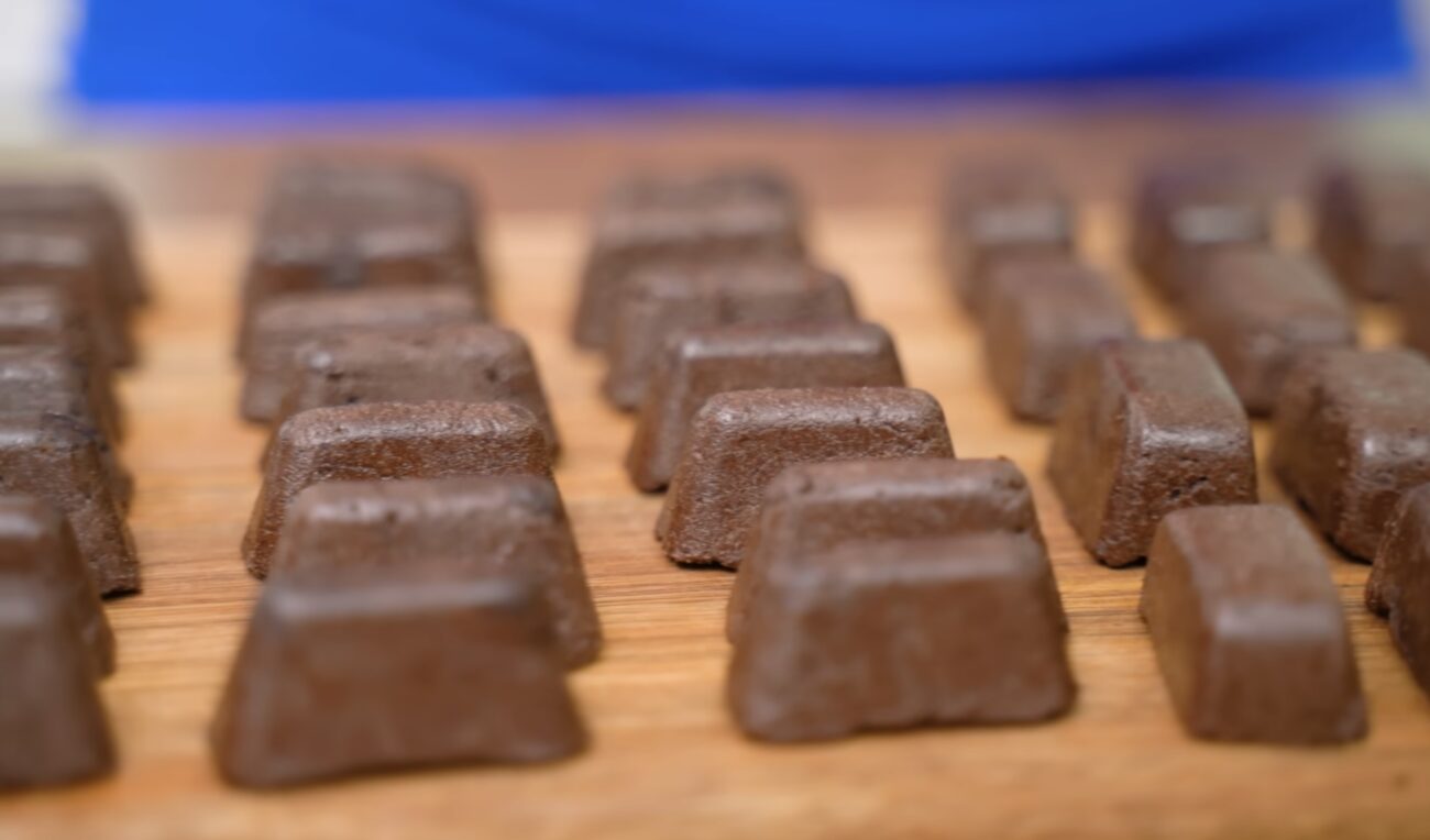Коли сироп готовий, обережно влийте його до суміші какао та молока. Добре перемішайте масу до однорідності. Вона вийде густою, тягучою та дуже ароматною. Поки шоколадна суміш ще тепла й гнучка, візьміть звичайні формочки для льоду (це, до речі, чудовий лайфхак, щоб не бруднити руки, формуючи кульки) і щільно набивайте їх ложкою чи руками.