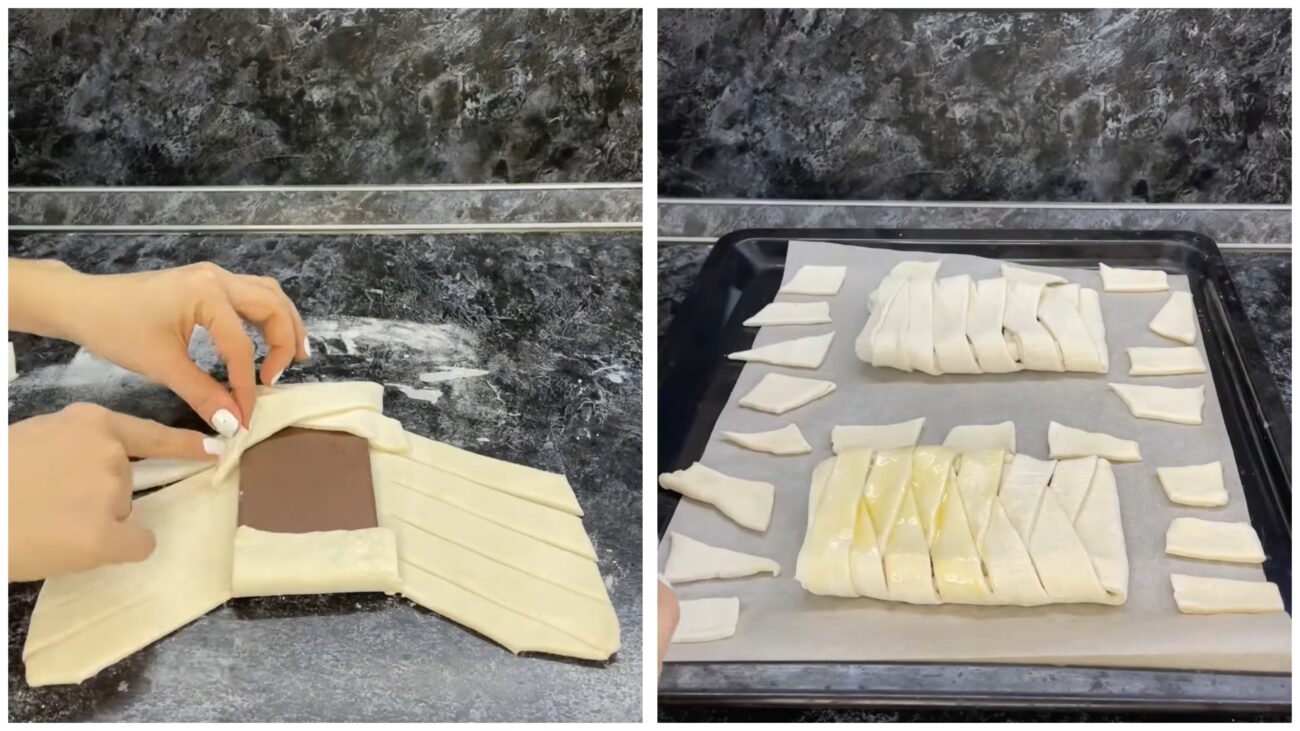 Далі — найцікавіше. Плитку шоколаду не потрібно ламати на шматочки, кладіть її цілою прямо по центру тіста. За допомогою гострого ножа зробіть косі надрізи по краях тіста, що залишилися вільними (вони мають нагадувати “ялинку” або смужки, які ми потім будемо переплітати).