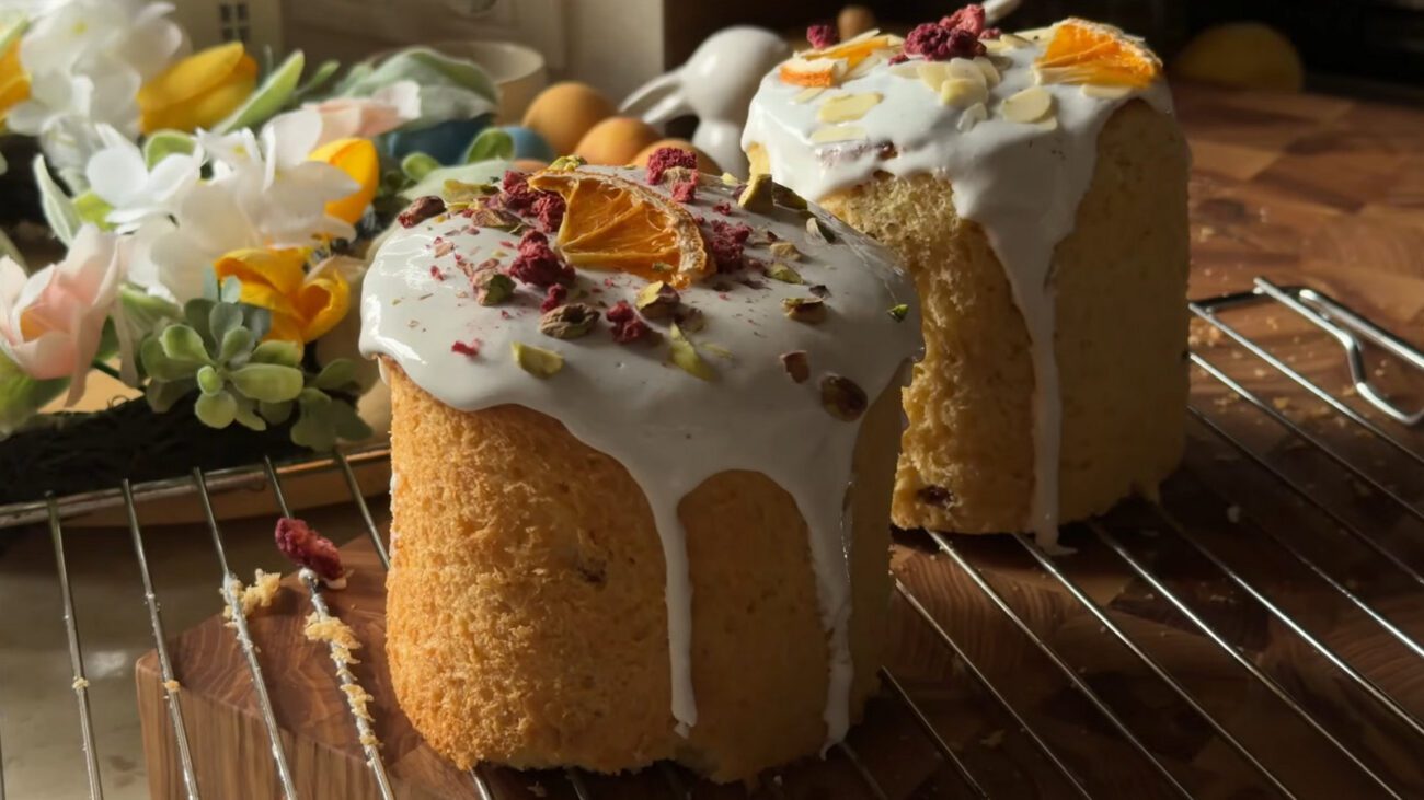 Розігрійте духовку до 160°C і випікайте приблизно 45 хвилин залежно від розміру форми. Перевіряйте готовність дерев’яною шпажкою – вона має виходити з середини сухою. Якщо верхівки вже темні, а всередині ще сиро, просто прикрийте їх фольгою зверху. Готові паски покладіть на бік прямо у формах, щоб вони не осіли під власною вагою, і дайте їм повністю охолонути.