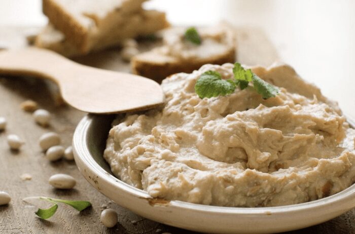 Промийте білу квасолю під холодною водою, щоб видалити зайву сіль і консерванти. Дренуйте квасолю. Використовуючи блендер або кухонний процесор, змішайте варену квасолю, насіння кунжуту (якщо використовуєте), оливкову олію, сік з лимона, нарізаний часник, мелений кумин, сіль і перець. Змішайте до отримання однорідної маси. Якщо суміш здається занадто густою, можна додати кілька ложок води для досягнення бажаної консистенції.