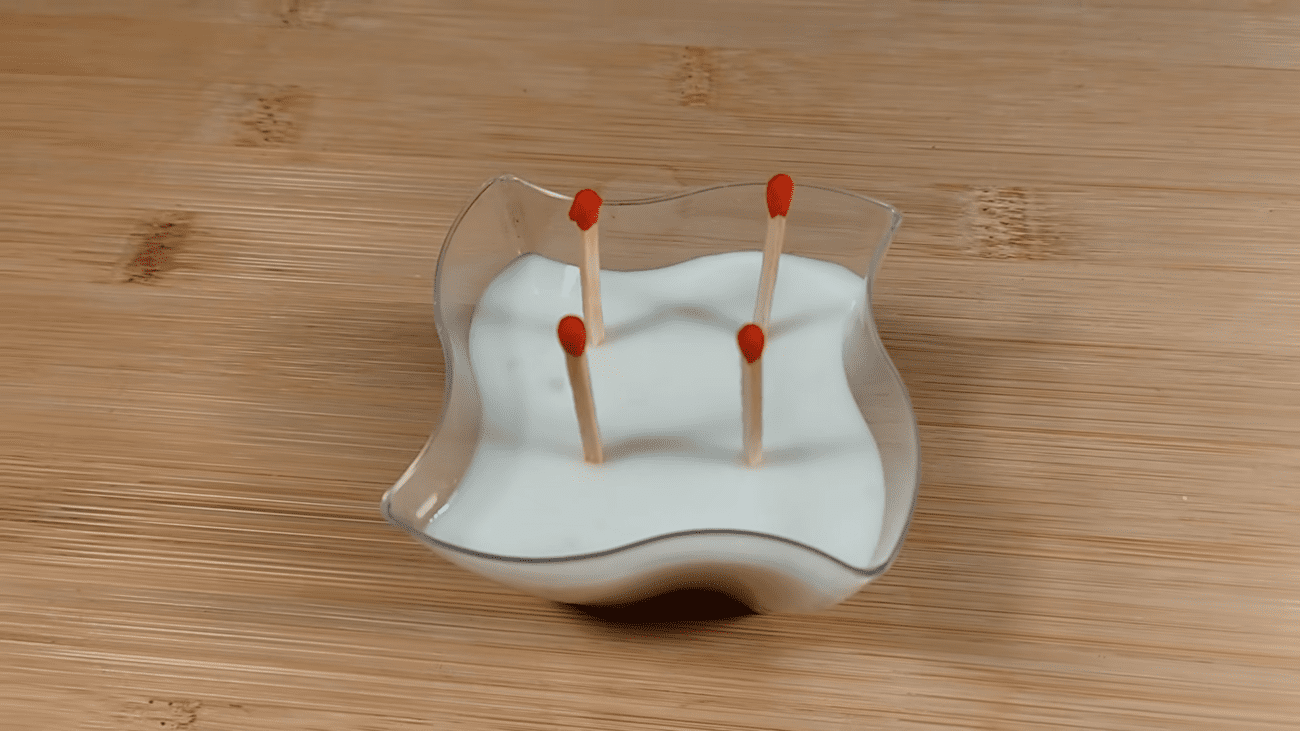 Далі переходьте до наступного кроку. Покладіть у суміш кілька звичайних сірників головками вниз і залиште їх приблизно на 10 хвилин. Час від часу обережно перемішуйте. Згодом помітите, що вода трохи змінює колір – це означає, що частина речовин із головок переходить у розчин.