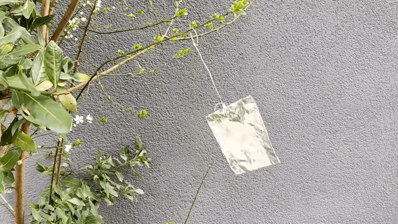 Повісьте фольгу на гілках дерев, біля вікон, дверей або в зоні грядок. Важливо, щоб вона вільно рухалася від вітру. Саме рух і відблиски створюють ефект, який відлякує птахів, мух та інших комах. Якщо немає можливості підвісити, просто розмістіть фольгу на відкритій ділянці — ефект також буде, хоча й трохи слабший.