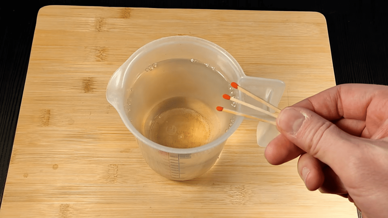 Через деякий час вода почне змінювати свій колір. Якщо обережно перемішати, процес піде швидше і стане помітнішим. Коли пройде кілька хвилин, дістаньте сірники й подивіться на воду. Вона вже не буде просто прозорою, адже в ній розчиняться певні речовини з головок сірників.