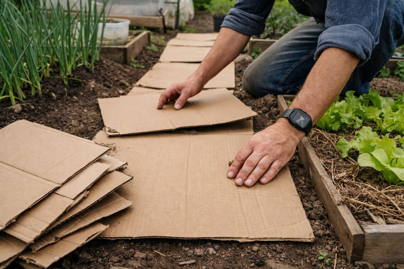Картон ідеально підходить для облаштування тимчасових доріжок між грядками. Він запобігає розмоканню ґрунту після дощів, тому взуття завжди залишається чистим.