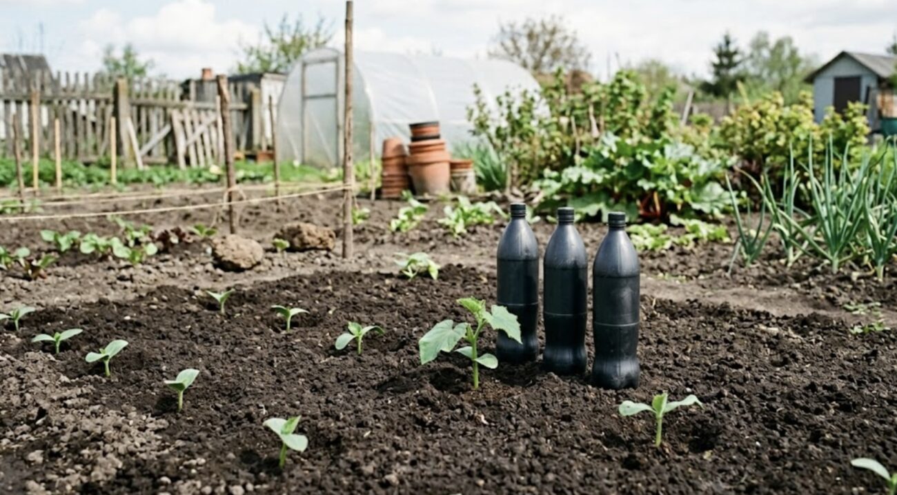 І що ж відбувається? Чорний колір добре вбирає сонячне тепло вдень, а вночі пляшки потрохи віддають тепло назад рослинам. Виходить своєрідний мікроклімат, який захищає огірки від нічного холоду без жодної вашої участі. Система працює автономно – приїхали на вихідні, перевірили, і все.