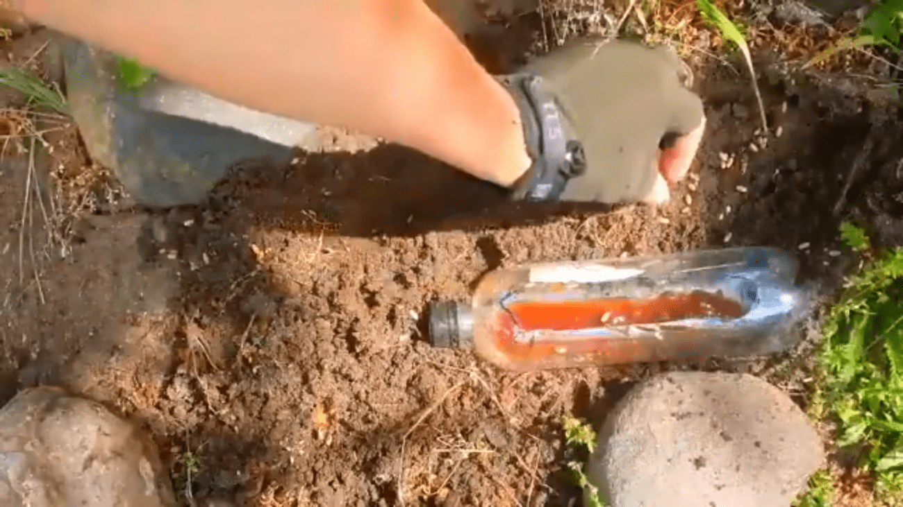 На дно пляшки викладіть тонкий шар варення або іншої солодкої маси. Цього достатньо, щоб привабити мурах. Для кращого ефекту нанесіть трохи солодкого і зовні – це створить “доріжку”, яка приведе їх у пастку. Після цього обережно встановіть пляшку в місці скупчення мурах, трохи заглибивши її в землю і присипавши краями. Усередині вони застрягають і не можуть вибратися, а інші мурахи продовжують приходити на запах.