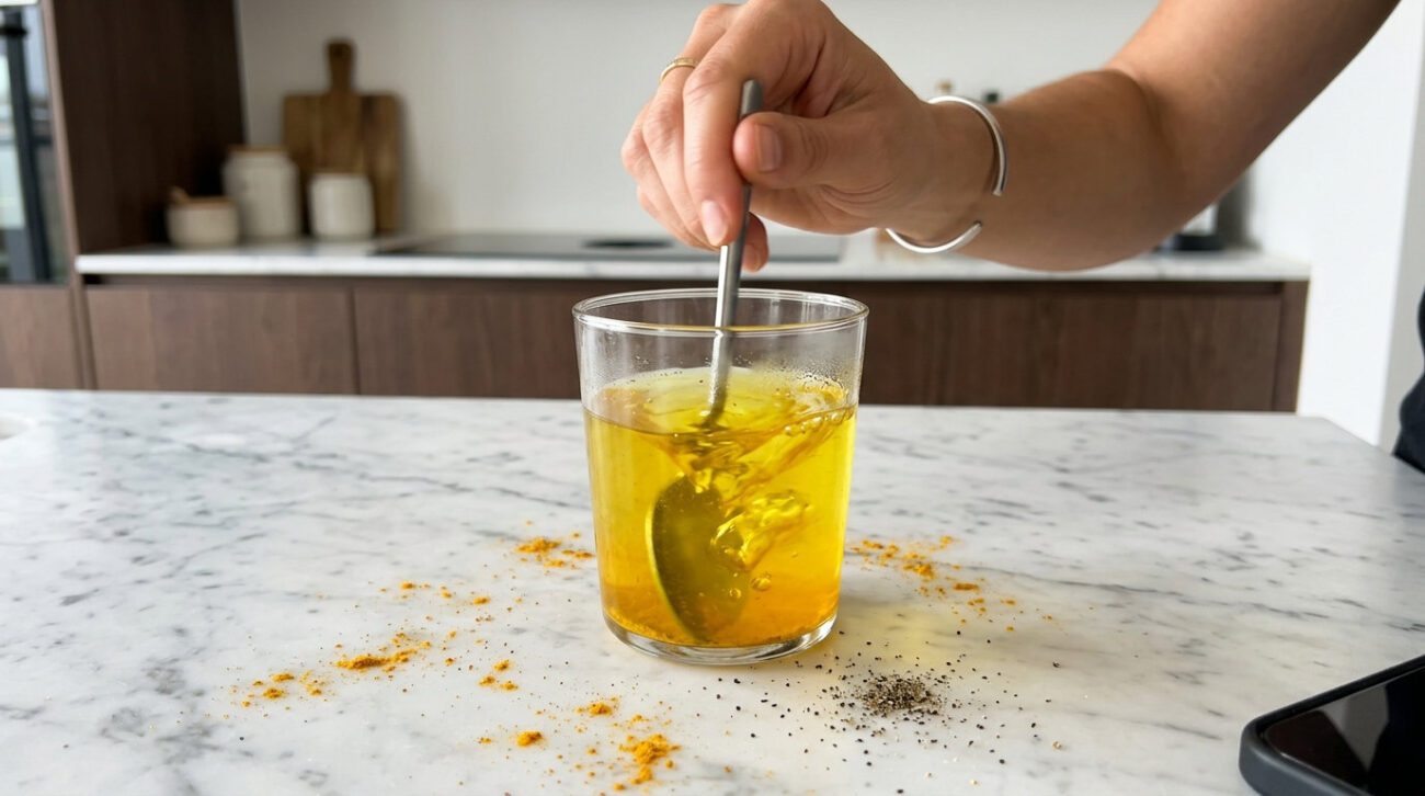 Підігрійте воду приблизно до 40 градусів. Вище не треба, бо можна подразнити стравохід, та й користі від напою ви отримаєте менше. Додайте туди пів чайної ложки порошку куркуми та дрібку чорного меленого перцю.