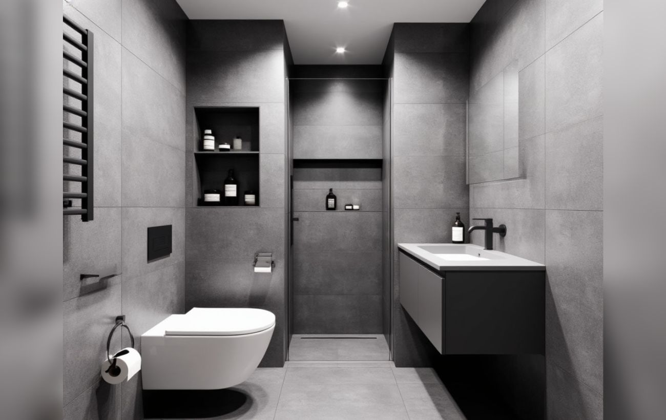 Для економії місць встановіть вбудовані у стінку полички для зберігання. Необовʼязково робити їх у вигляді шаф – навіть відкритий варіант виглядає доволі стильно та сучасно, це видно з фото. Обираючи умивальник, віддавайте перевагу навісним – вони забирають не так багато місця. А ось простір під умивальником ви зможете використати для прихованого зберігання засобів для прибирання, ганчірок та такого іншого.