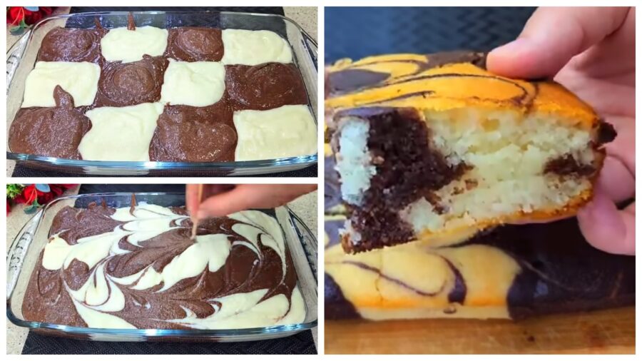 Тепер змастіть форму для випікання рослинною олією й за допомогою столової ложки викладайте у форму тісто, чергуючи світле й темне, у шаховому порядку, а тоді дерев’яною шпажкою або зубочисткою створіть довільний візерунок на поверхні тіста. Це додасть десерту ефектного вигляду.