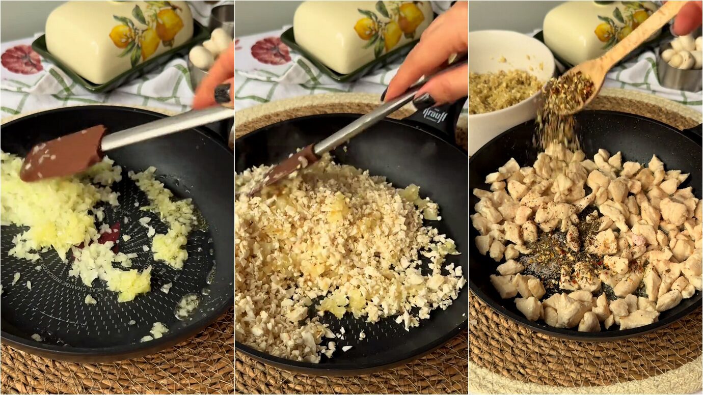 Перекладіть цибулю з грибами в миску, а на тій же сковорідці обсмажте нарізане невеличкими шматочками куряче філе. За кілька хвилин до готовності до м’яса треба додати спеції. Їх можете обирати собі до смаку. База — сіль та чорний перець. Також можна додати копчену паприку, сушений часник і трави. Чудово, якщо трави свіжі, але якщо їх немає під рукою, то підійдуть сушені — за кілька хвилин вони розкриються.