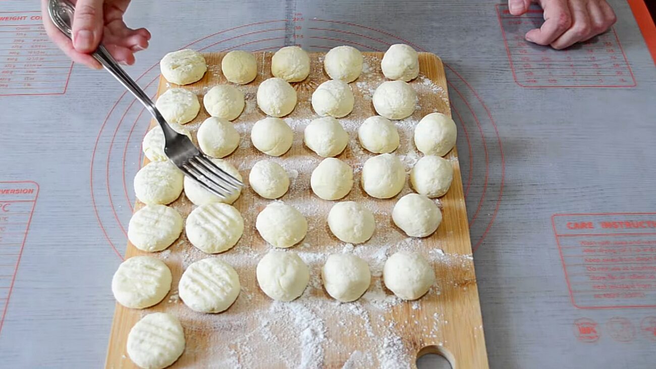 Далі поступово вводьте борошно, масу не потрібно робити крутою – вона має бути м’яка, трохи липка, але така, щоб можна було сформувати ковбаску, присипте стіл борошном, сформуйте ковбаски й наріжте їх невеликими шматочками по 2 см, кидайте у киплячу підсолену воду, як тільки спливуть – варіть ще 1-2 хвилини, не більше.