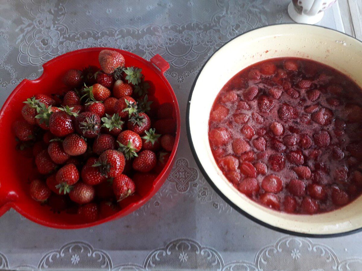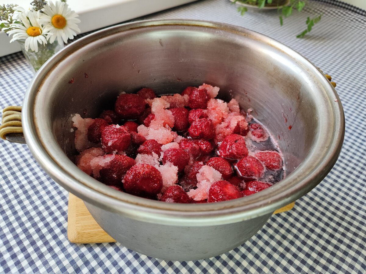 Спершу потрібно добре промити полуницю та висушити її. Видаліть хвостики, а дві третини ягід подрібніть у блендері. Залишок потрібно нарізати великими шматочками – так варення буде ідеальної текстури. Цукор додайте до ягід і поставте варитись на плиту. Доведіть суміш до кипіння, не припиняйте постійно перемішувати варення. Варіть його 3 хвилини на слабкому вогні.
