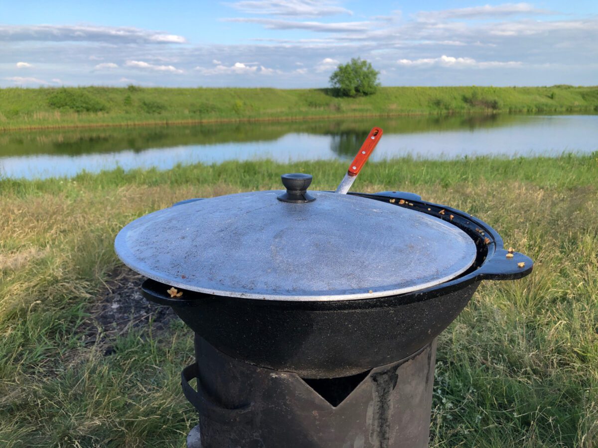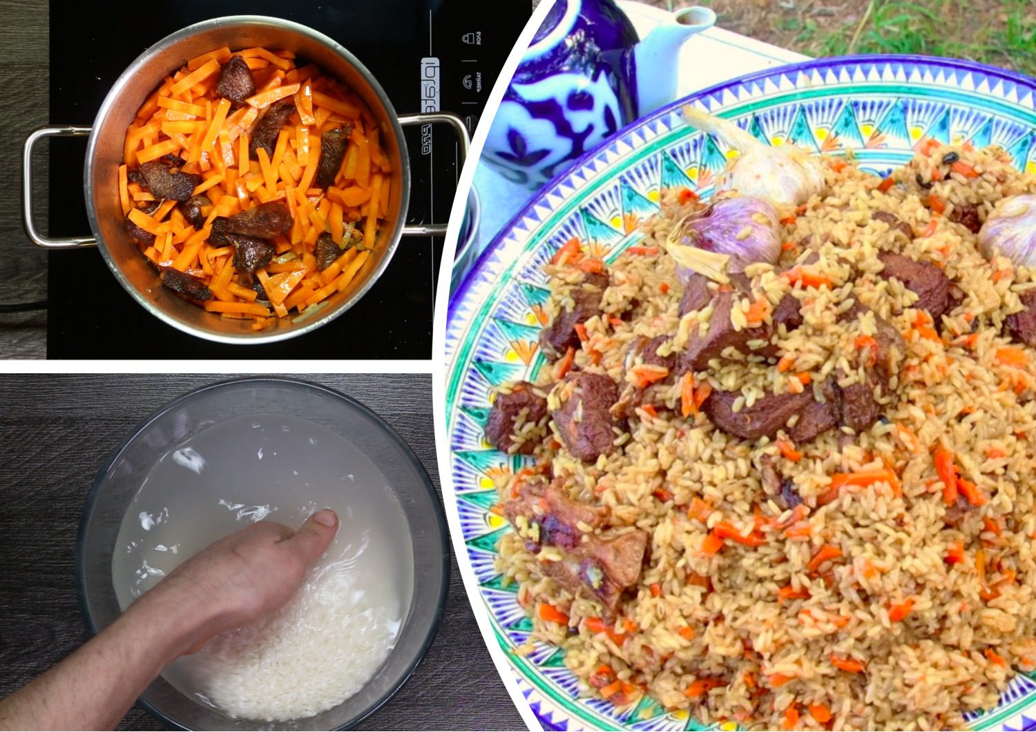 У чайнику закип’ятіть кілька літрів окропу і залийте м’ясо з овочами у казані так, аби воно було покрито водою у рівень. Вставте часник і накрийте казан кришкою, зменште вогонь до мінімуму. Залиште м’ясо тушкуватись на півтори години. Після цього рівномірно розподіліть промитий рис у казані. Залийте все окропом, аби рівень води був трішки вищим за рис. Готуйте плов, поки рис не стане готовим, але злегка твердим всередині.