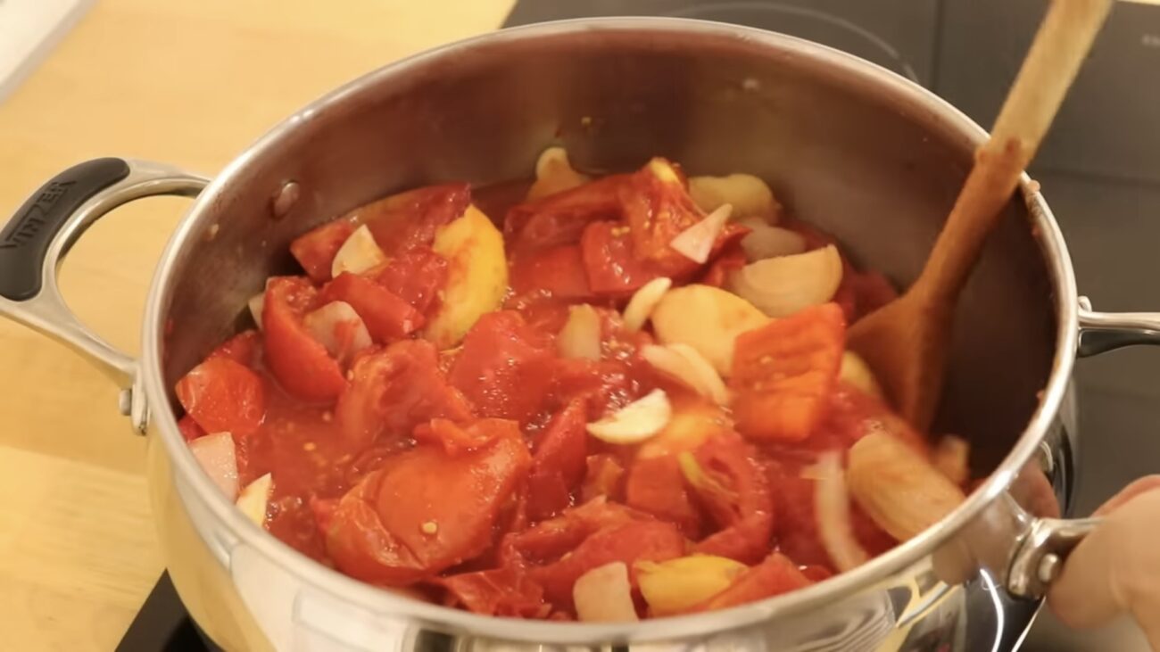 Наріжте овочі і яблука середніми шматками та складіть у велику каструлю з товстим дном. Злегка подавіть ложкою або товкачкою, щоб помідори пустили сік. Поставте на слабкий вогонь і варіть 1,5 години, періодично помішуючи. Слідкуйте, щоб нічого не підгоріло і не прилипло до дна каструлі.