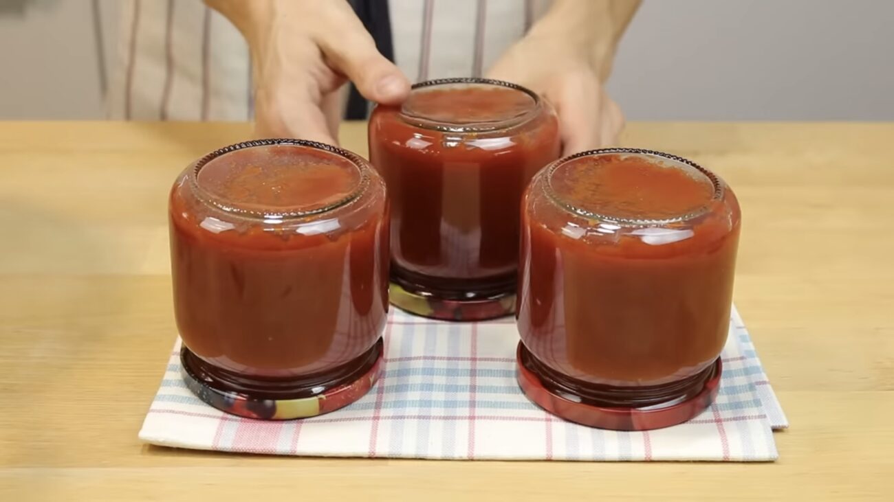 Під кінець влийте оцет, перемішайте й дайте прокипіти ще 2-3 хвилини. Витягніть лаврові листки, гвоздику і розлийте гарячий кетчуп у стерильні банки, закатайте як зазвичай, переверніть вверх дном і залиште остигати під ковдрою.