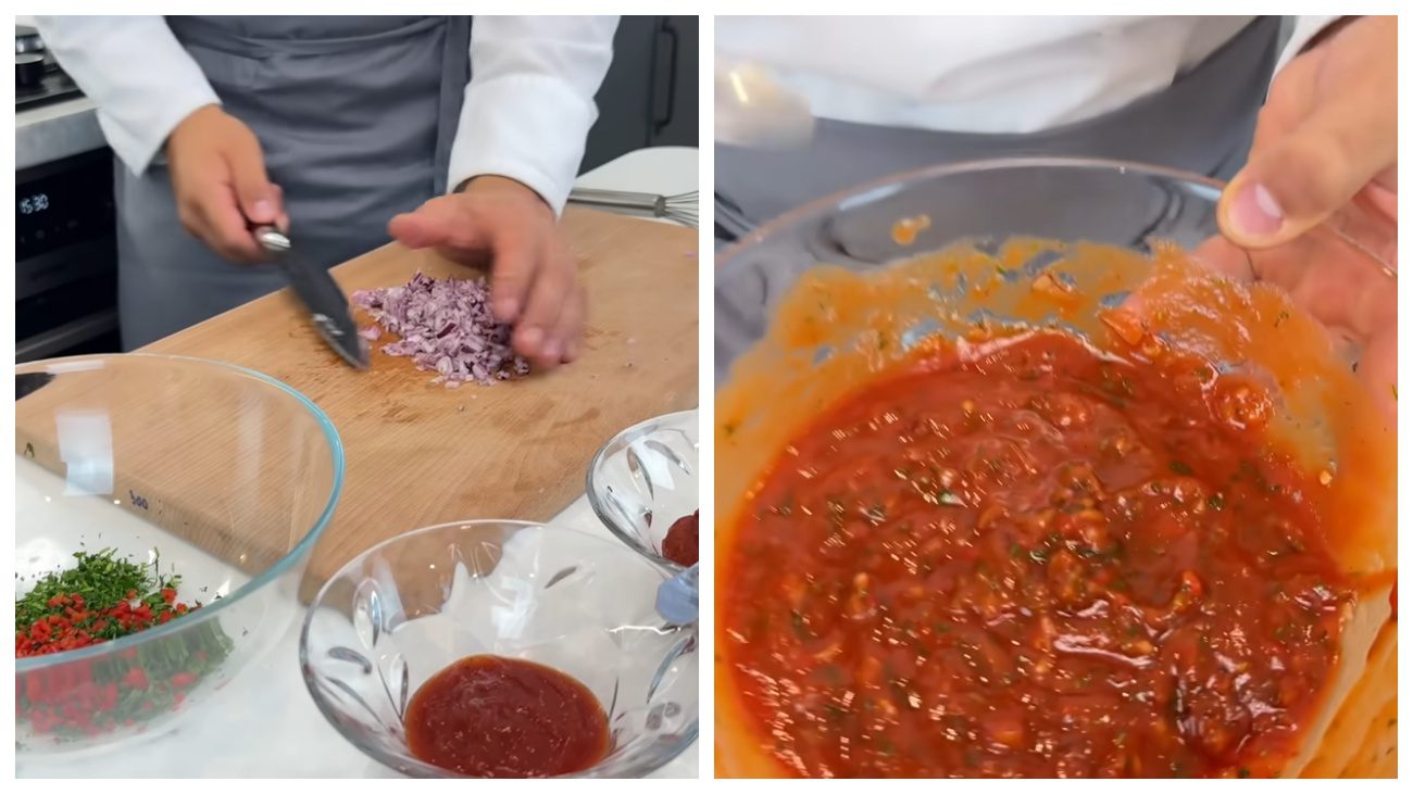 Тепер у глибокій мисці змішайте подрібнену зелень, цибулю та перець. Додайте до них томатну пасту й соус “Херсонський” — вони точно подарують глибину смаку й той самий ефект, ніби соус настоявся добу.